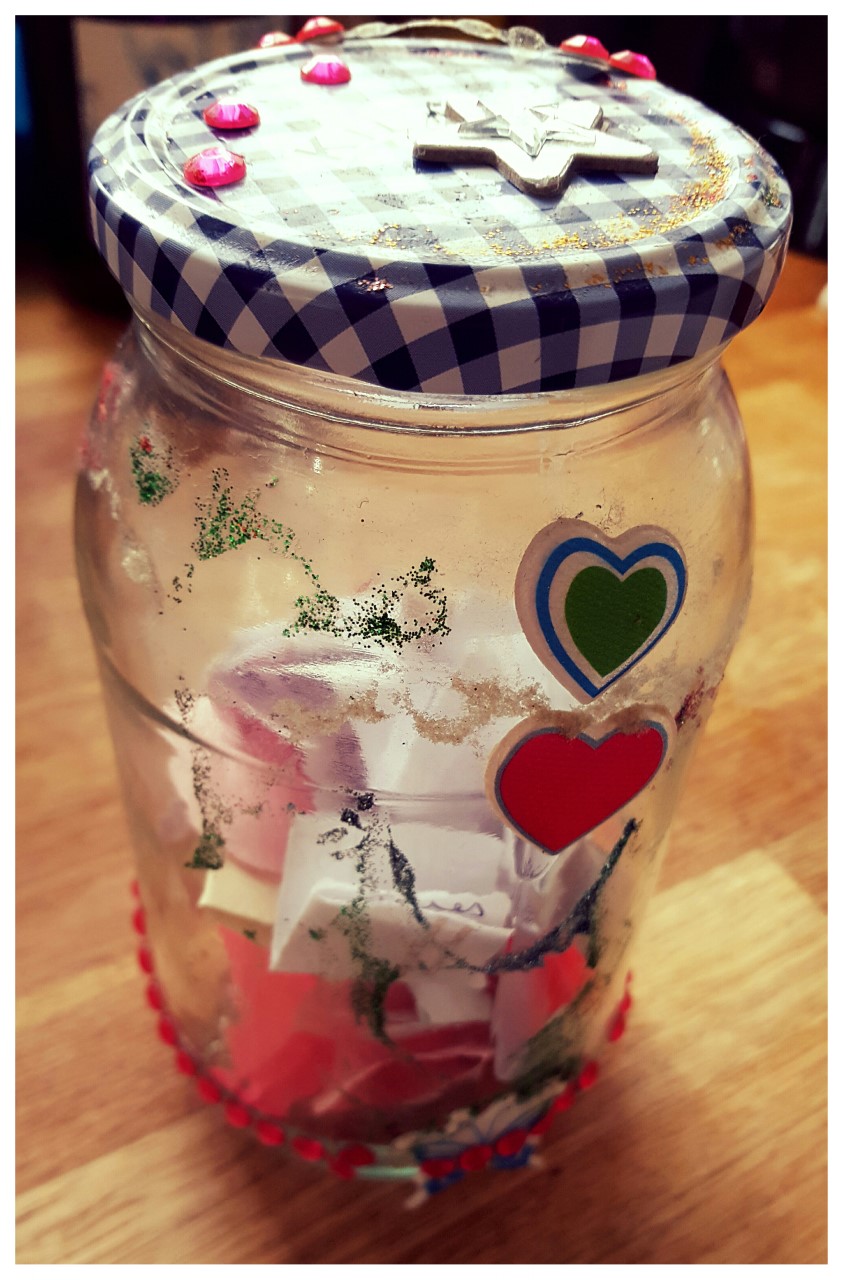 Just 2 years ago, after the loss of a loved one, which hit our family at it’s core, I decided to create the grateful jar. It’s a jam jar that sits in our kitchen, which Elsa decorated with stickers. It serves as a constant reminder for all the good things in our lives. Any of us can add to the grateful jar at any time and it can be about anything at all; we just pop it on a scrap piece of paper and put it in the jar. On New Year’s Eve we empty the grateful jar, read them all and stick them in a scrap book that gets added to each year.